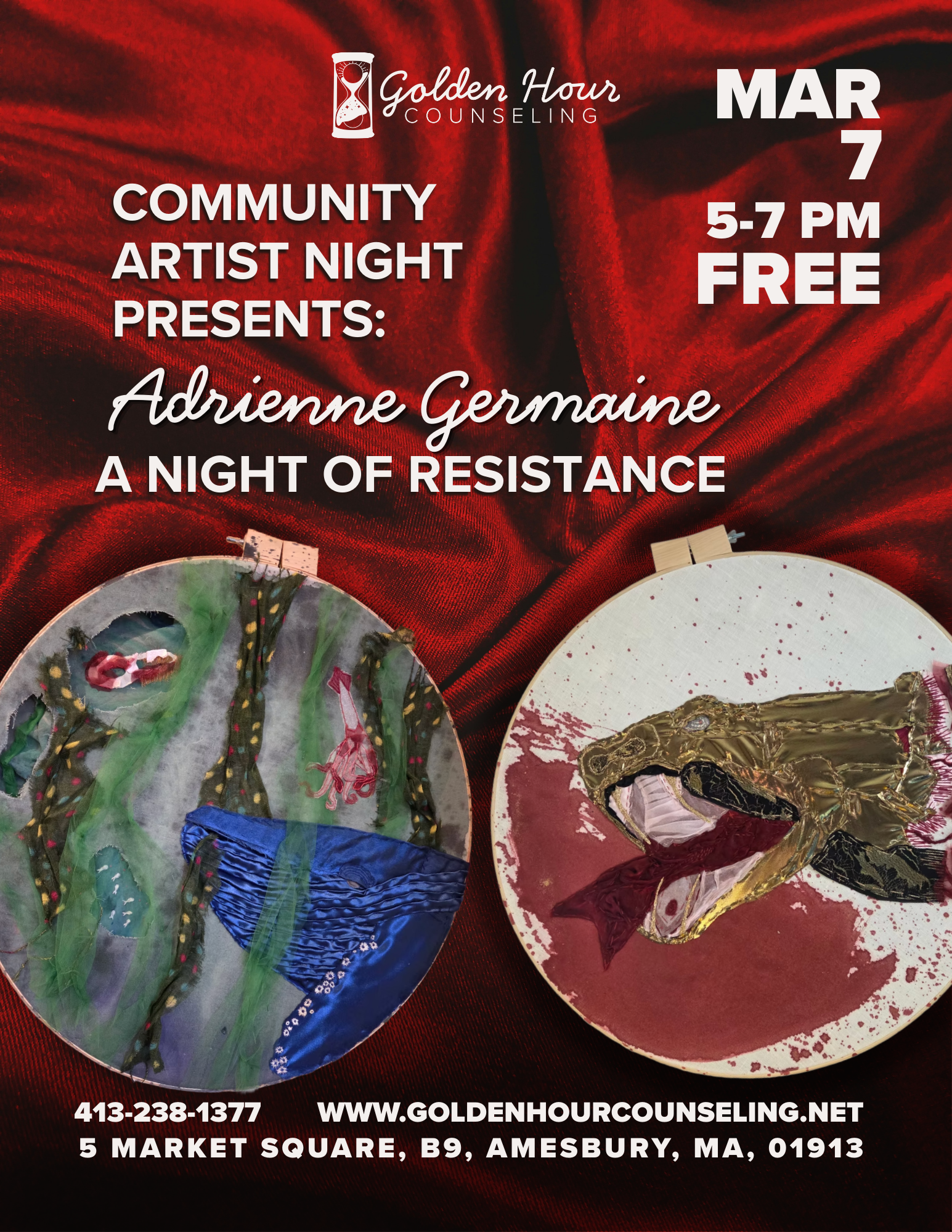 This very special night showcases Resistance, by Adrienne Germaine. This display includes layers of fabrics, On Saturday, March 7th from 5-7 pm. This event will include a DIY Canvas Hourglass workshop, which will be shared with clients and attendees. This workshop encourages self-expression and RESISTANCE, an unwillingness to adhere. Light appetizers & mocktails will be served. This event is free to the community.