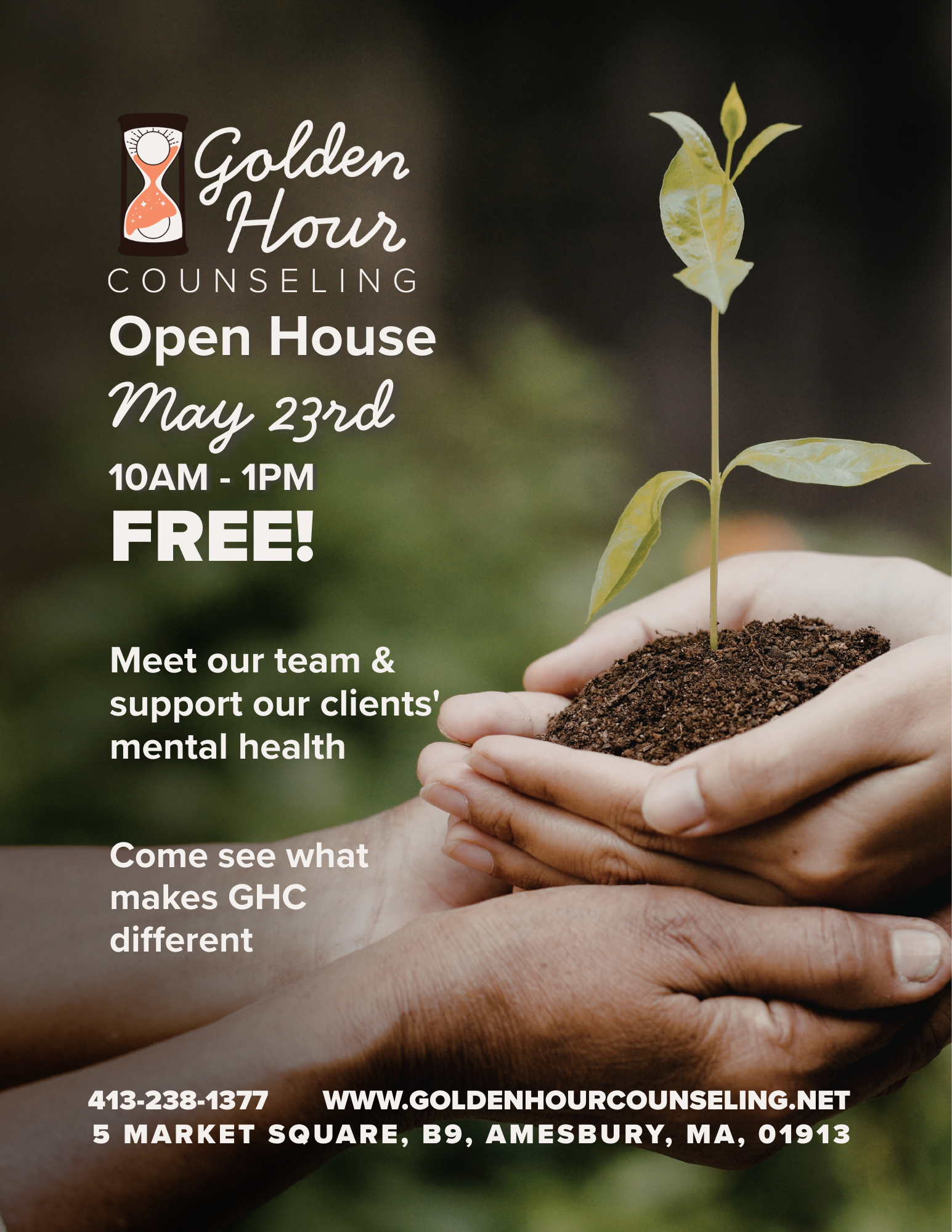 Golden Hour Counseling PLLC welcomes the community to our Spring Open House event, happening on May 23rd, 2026! Come join us from 10AM-1PM to meet our team & support our clients’ mental health. Ever wonder what makes Golden Hour Counseling PLLC different? Come join us to see!