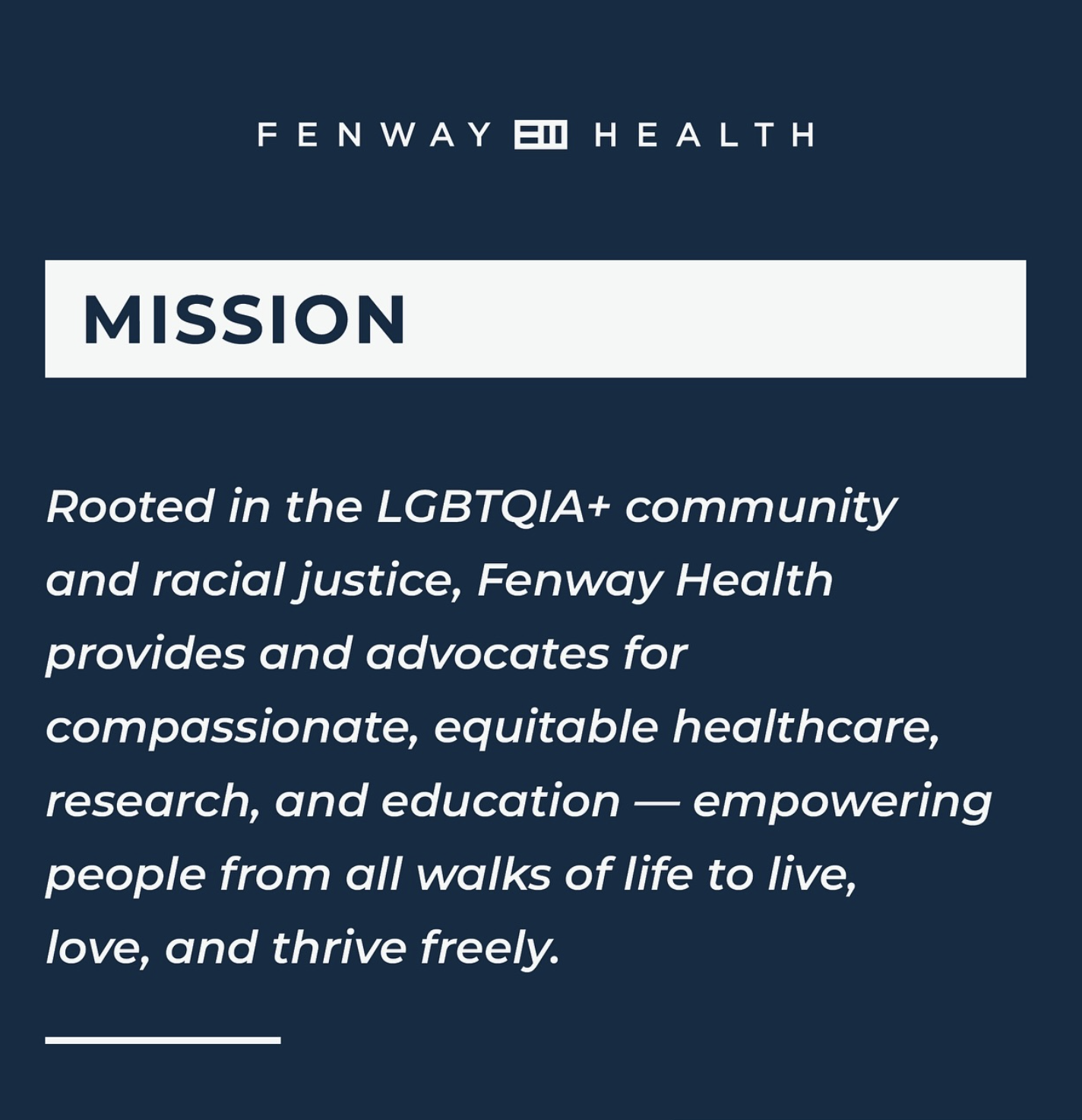 Fenway Health advocates for and delivers innovative, equitable, accessible health care, supportive services, and transformative research and education. We center LGBTQIA+ people, BIPOC individuals, and other underserved communities to enable our local, national, and global neighbors to flourish.